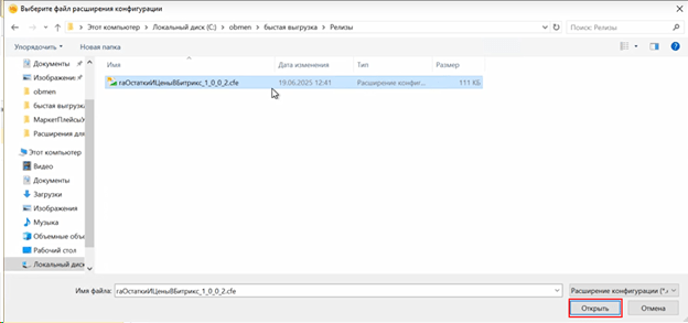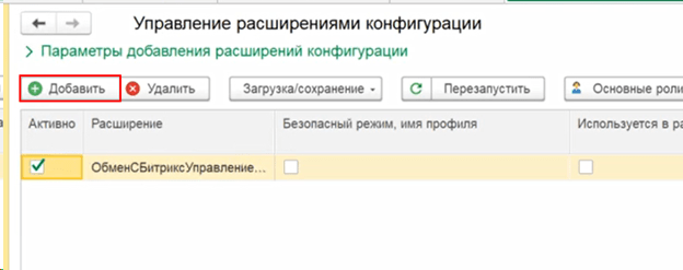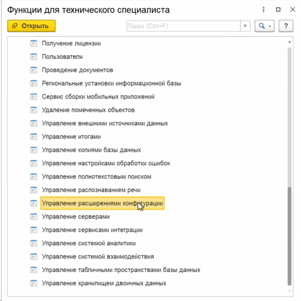 Для установки расширения необходимо через функции для технического специалиста открыть раздел Стандартные - Управление расширениями конфигурации