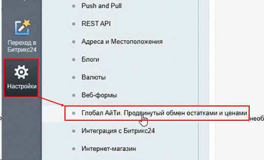 Далее переходим в Админимстрирование сайта в раздел Настройки - Продвинутый обмен остатками и ценами