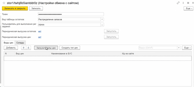 Для закрузки видов цен переходим на вкладку Виды цен. Нажмите «Загрузить типы цен»