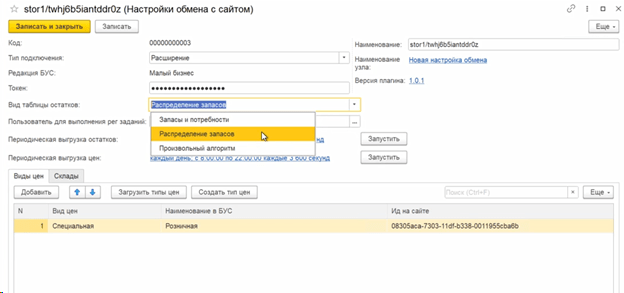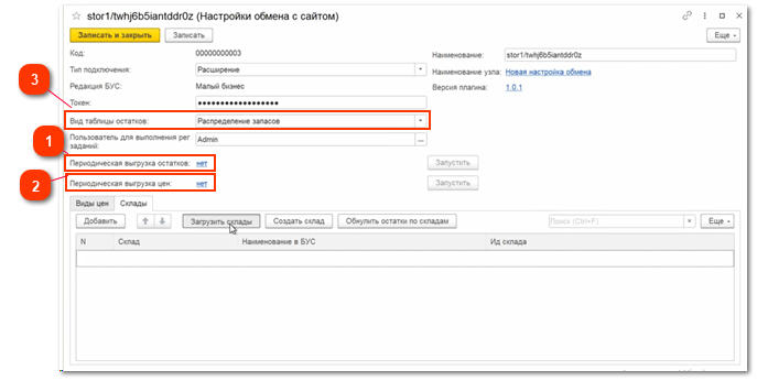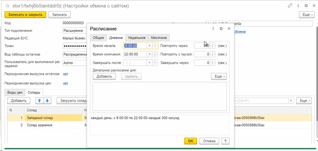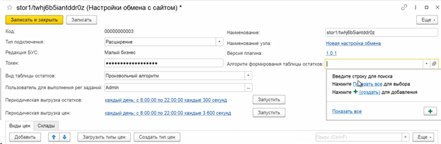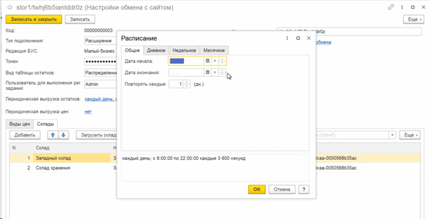 Так же можно настроить расписание выгрузки остатков (1) и цен (2)
