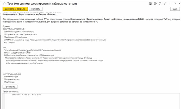 Если выбран произвольный алгоритм: 1. Перейдите в справочник «Алгоритм формирования таблицы остатков» 2. Напишите свой запрос для формирования таблицы остатков 3. Верность синтаксиса написанного алгоритма можно узнать кнопкой «Проверить» 4. При успехе : «Алгоритм прошел проверку» 5. Сохраните настройки