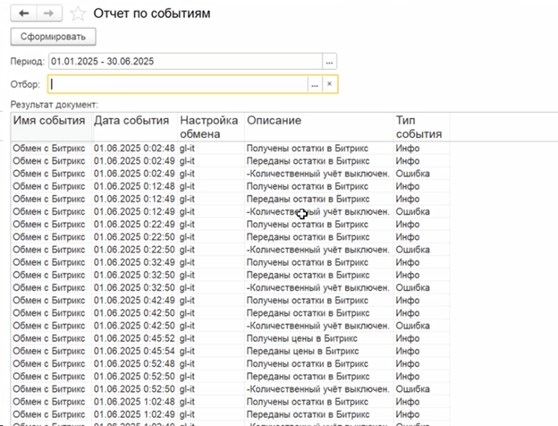 В Отчете по событиям необходимо выбрать период При необходимости можетесделать отбор Нажмите «Сформировать» Просмотрите историю выгрузок: когда, что и из каких настроек выгружалось