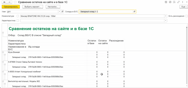 Откройте "Сравнение остатков на сайте и в базе 1С" Выберите сайт для сравнения Вы увидите флажки для всех ваших складов: Оставьте все флажки отмеченными - система покажет запасы по ВСЕМ складам Отметить только определенные склады - сужает сравнение только до этих местоположений Для просмотра только расхождений установите галочку "Есть расхождения" Нажмите «Сформировать»