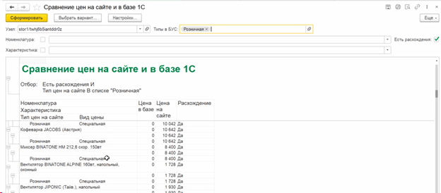 По такому же принцыпу работает отчет Сравнение цен на сайте и в базе 1С