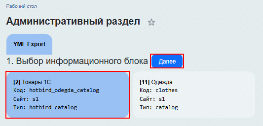 В открывшемся окне выберите Информационный блок (каталог товаров), который вы хотите выгрузить.