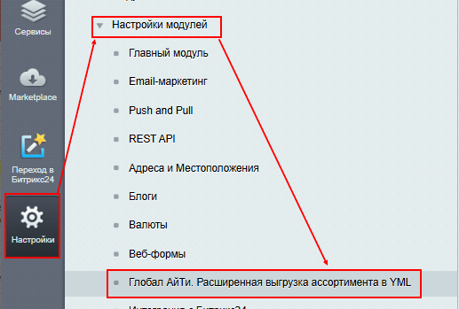 Перейдите в раздел Настройки – Настройки модулей – Глобал АйТи. Расширенная выгрузка ассортимента в YML.