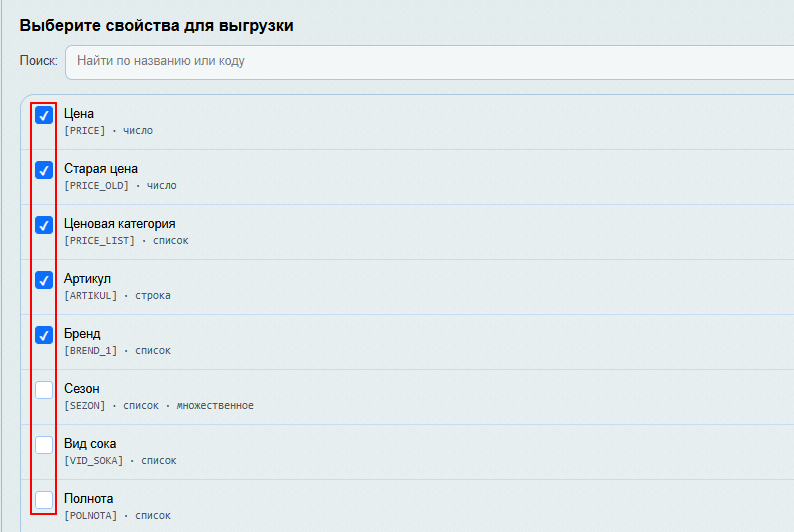 Прокрутите страницу ниже, до блока «Свойства для выгрузки». Здесь отображается список всех свойств товара (артикул, цвет, размер, материал и т.д.). Выберите все или же несколько конкретных свойств , установив напротив них галочки.