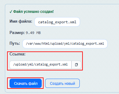 Если вам нужна локальная копия YML-файла на компьютере (например, для проверки или ручной загрузки в некоторые системы), нажмите кнопку «Скачать файл».