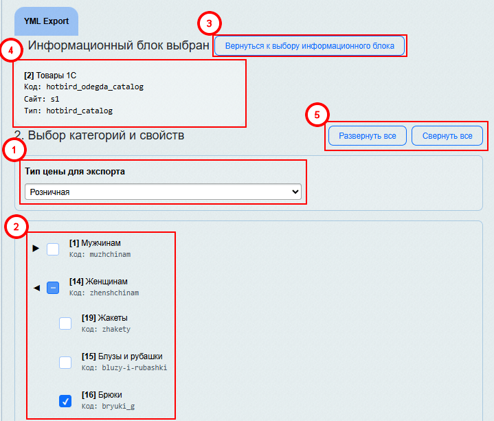 Не выбирать раздел (оставить пустым): раздел и его товары не будут включены в выгрузку.